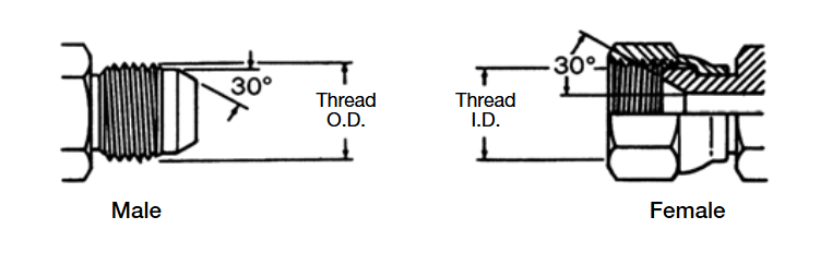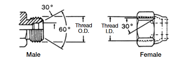 日標30°擴口外螺紋接頭僅與日標30°擴口內螺紋接頭相配。外螺紋接頭和內螺紋接頭都有螺紋和30°錐面。密封是通過30°錐面來實現的。日標30°擴口接頭符合JISB0202標準,與英制BSPP螺紋一樣。英制接頭和日標接頭也都有30°錐面,但是他們不能互換使用,因為英制錐面是相反的。